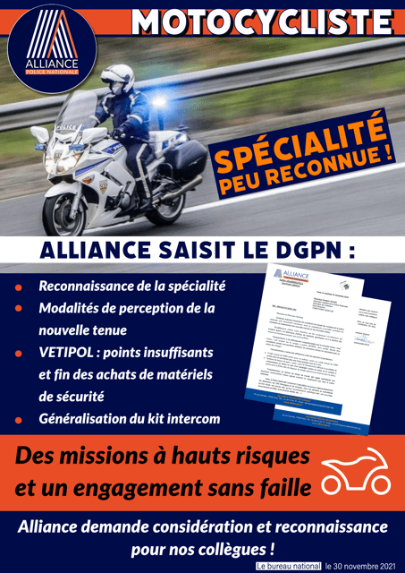 Spécialité peu reconnue ALLIANCE SAISIT LE DGPN: Publication : 30 novembre 2021 Lire la suite... Motocycliste