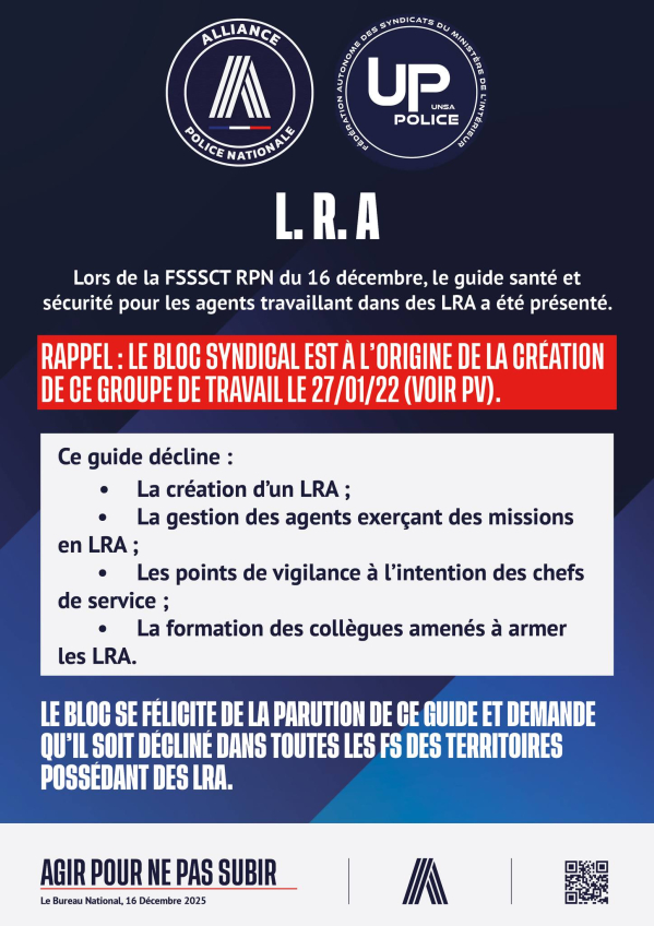 FS SSCT RPN LRA L. R. A Lors de la FSSSCT RPN du 16 décembre, le guide santé et sécurité pour les agents travaillant dans des LRA a été présenté. Rappel : le bloc syndical est à l’origine de la création de ce groupe de travail le 27/01/22 (voir PV). Publication : 16 décembre 2025 Lire la suite... PAF, Bureau National